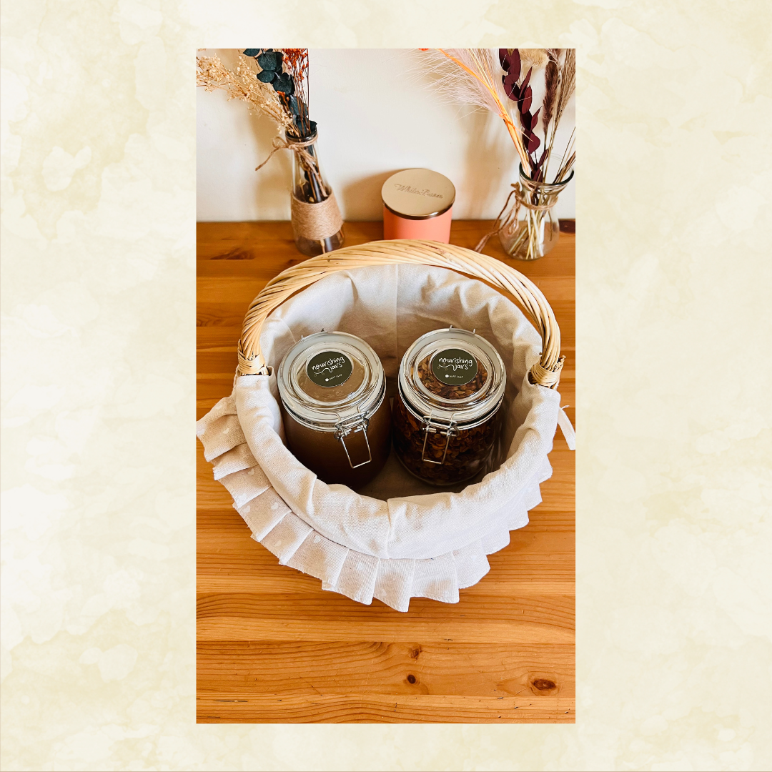 The perfect gift for the one you care about - our customizable Gift Basket, filled with a selection of sugar-free, natural and homemade products. Choose the finest items to create a wholesome and delicious collection tailored to inspire joy and promote well-being. This thoughtful gift is ideal for anyone who appreciates pure, nourishing treats crafted with care.